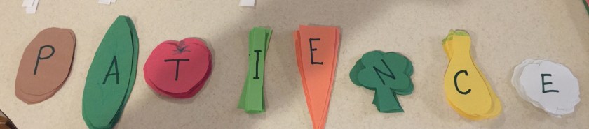 - Construction paper cut into 8 vegetable shapes (or use clip art), each one lettered to spell “P-A-T-I-E-N-C-E” (see illustration at top of page); 8 vegetable shapes per team